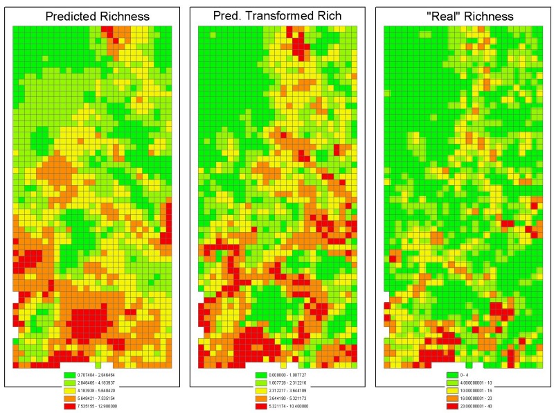 Here are the predictions of the Bayesian modelling exercise on the protea species richness of the Kogelberg-Hawequas area. They are: (left) The actual predictions based on what species richness should be in a pristine environment. The richest cell has 13 species. (centre) What we currently see due to transformation of the land by man (chiefly agriculture, afforrestation, urbanization anda aliens. The richest cell has 10 species. (right) Actual species richness (out of 160 species). The richest cell has 40 species.